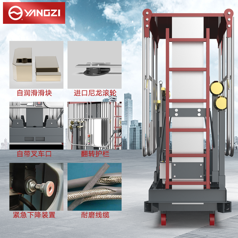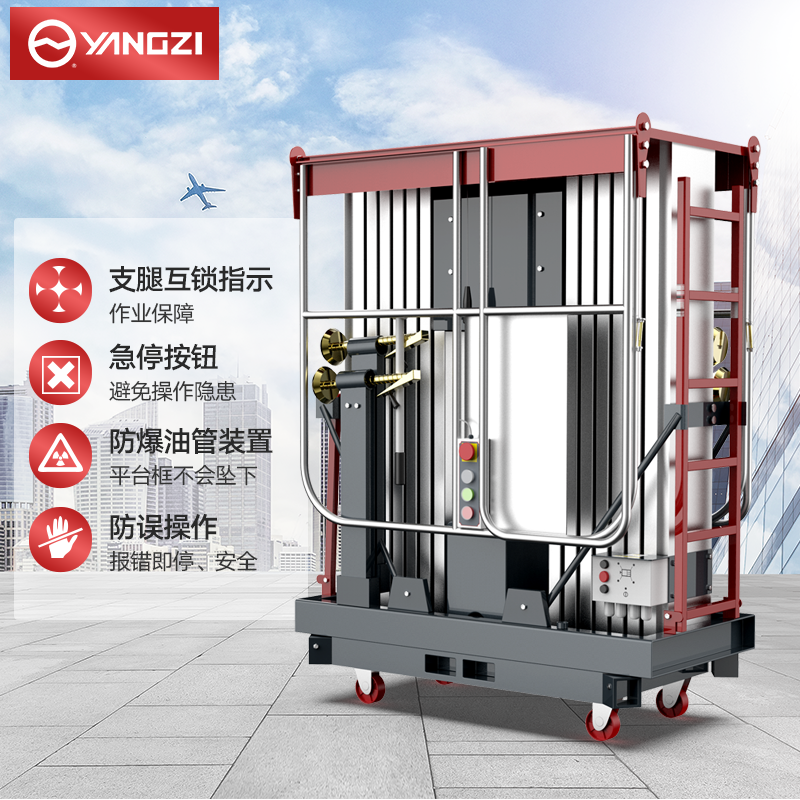 揚子高配雙柱鋁合金升降機YZGS2:擁有雙電源操作平臺,防誤操作按鈕更安全,多場景使用,可以商用維護物業(yè)維護工業(yè)安裝等。